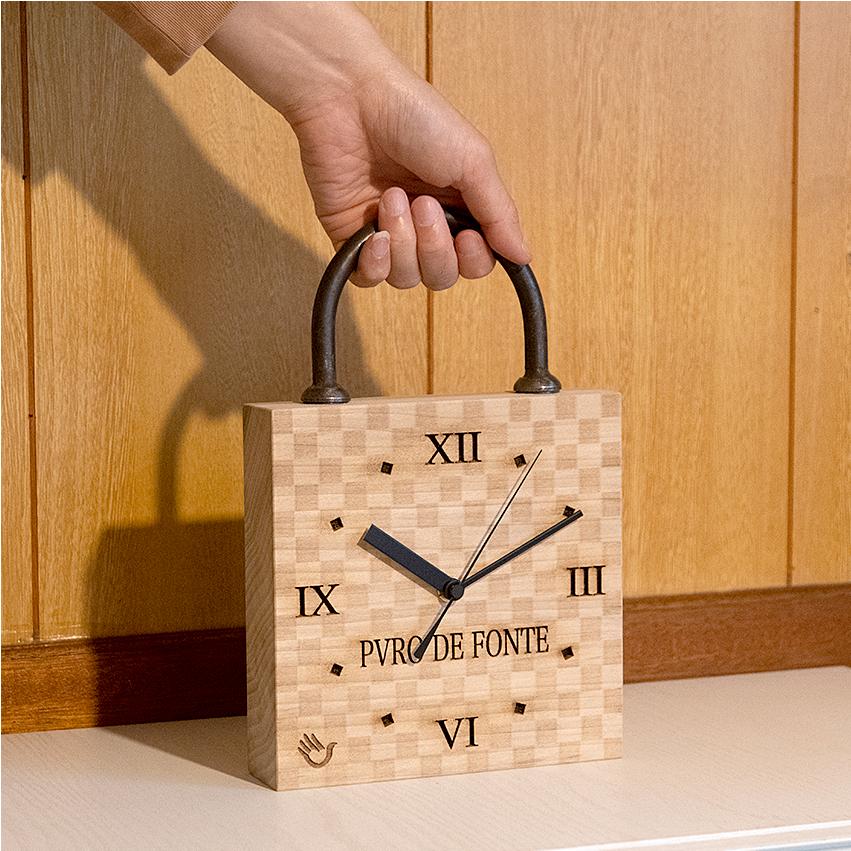 Magnolia Wood Clock, Checkered Pattern, Iron Kamaboko Handle
